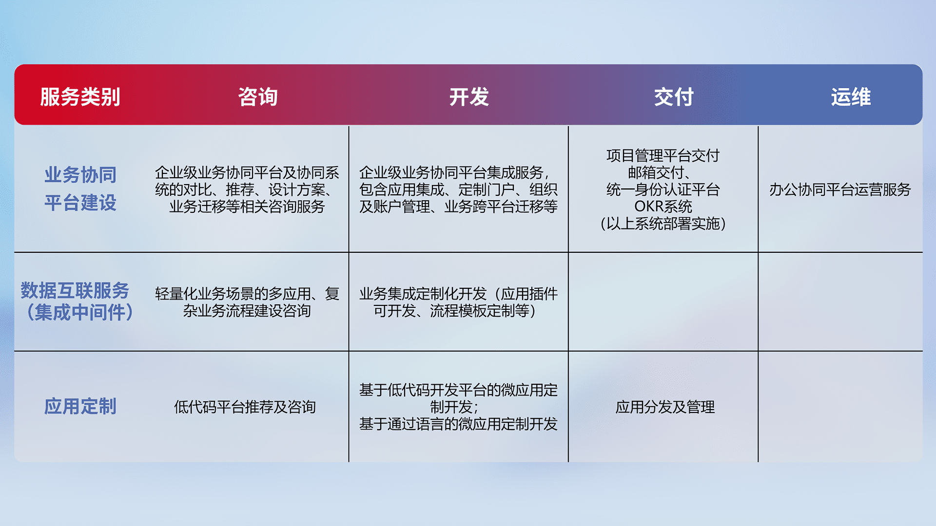 针对钉钉、、企微、、、、IDaas等平台级产品提供产品的规划、、、方案、、、交付、、定制化开发等服务,,,,实现如统一协同办公、、、智能客户服务、、混合会议管理、、、、智能数据查询、、、等业务场景,,,,实现数字化转型。。