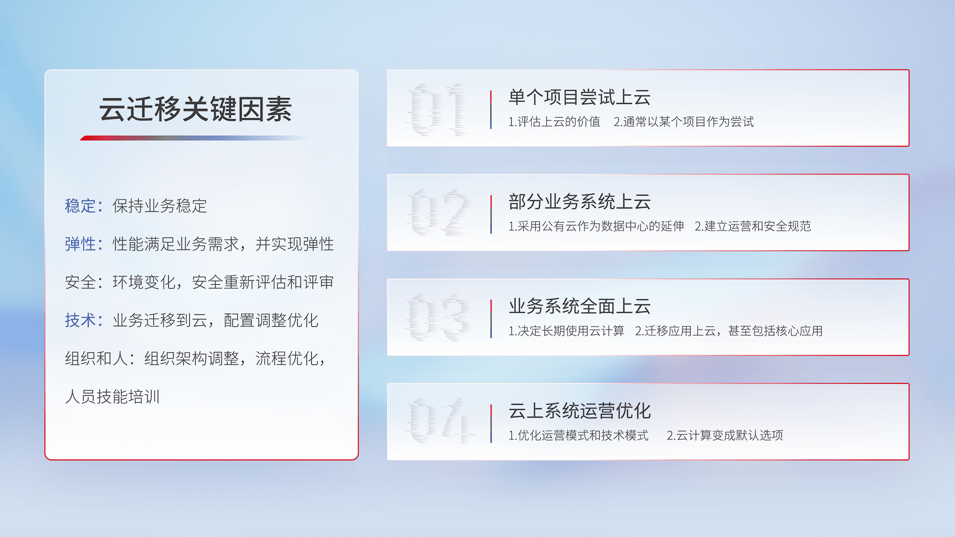 结合实际业务,,,从规划设计、、云平台选型、、云原生改造、、、、数据迁移、、、、集成交付,,迁移全过程为客户识别最佳上云路径,,做好风险识别管理,,,设计网络架构、、身份权限、、、安全审计合规、、操作审计、、、、日志审计、、监控告警策略、、、多站点容灾设计等,,对云上基础设施进行整体规划,,,,提升IT治理水平,,以满足弹性、、、、高可用、、、高性能的需求。。。。