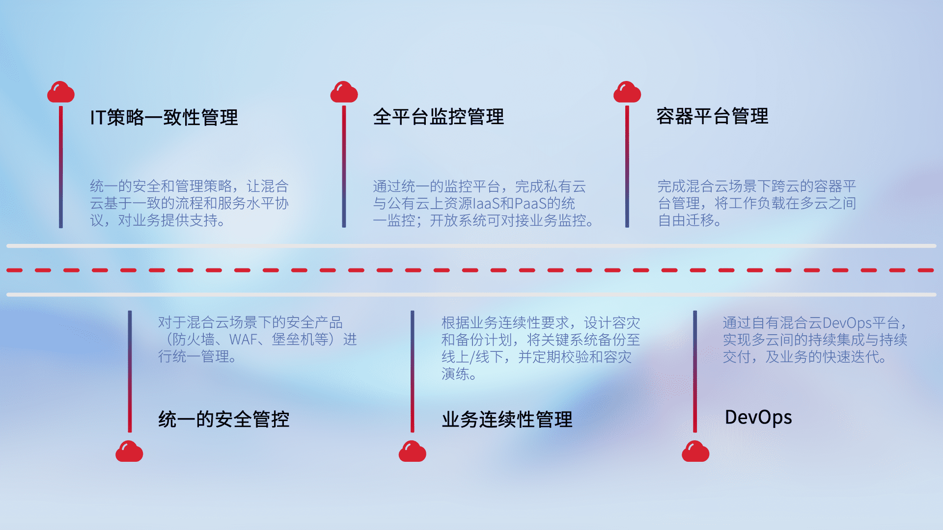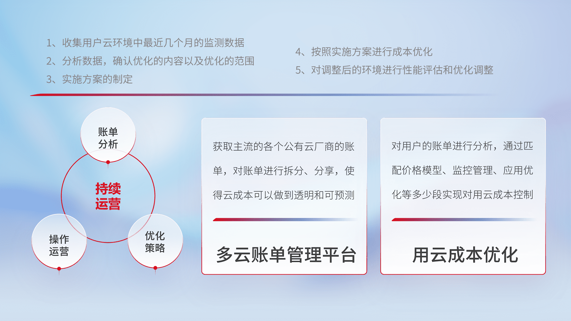 通过多云纳管,,,,以统一的资源数据模型把客户的云资源进行抽象和封装,,进而实现对多云资源的统一操作,,,,保障云资源管理的可靠性、、稳定性与可用性。。。。量身定制化运维内容,,,,配置、、、开发运维、、补丁管理、、、、备份、、、监控、、、、认证和访问管理、、审计和日常巡检等,,,,保障在用云过程中的可靠度,,,稳定度以及高可用率。。